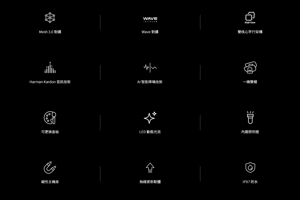 | 群組對講 | ‧ WAVE 對講:幾乎無限 ‧ 藍牙對講:4 名騎士 ‧ 網狀公開模式對講:幾乎無限 ‧ 網狀群組對講:24 名騎士 |
