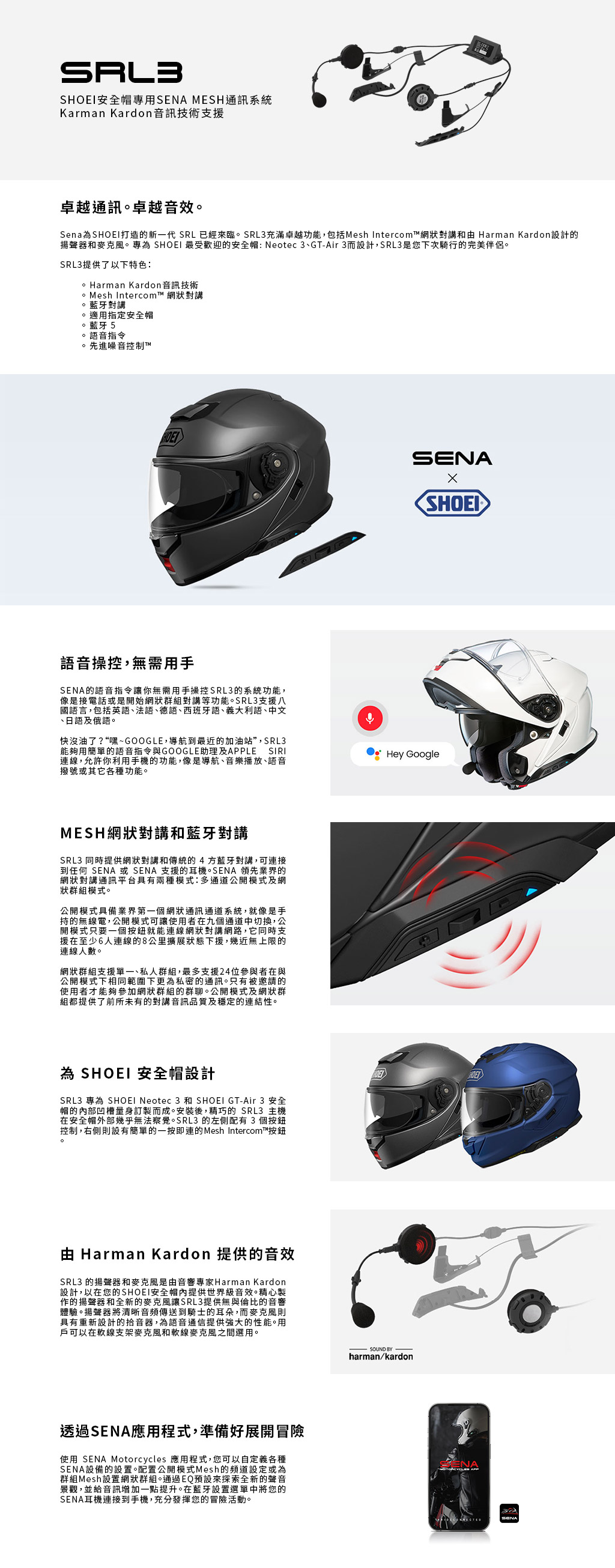 | 對講 | ‧ 連線距離: 。藍牙對講:最遠2公里,在空曠區域 。網狀對講:最遠2公里*,在空曠區域 (*在最少6位騎士連線下,可擴展至最遠8公里) ‧ 最大支援: 。藍牙對講:4位騎士 。網狀公開模式:無上限 。網狀群組:24位騎士 ‧ 支援通道: 。公開模式:6通道 |