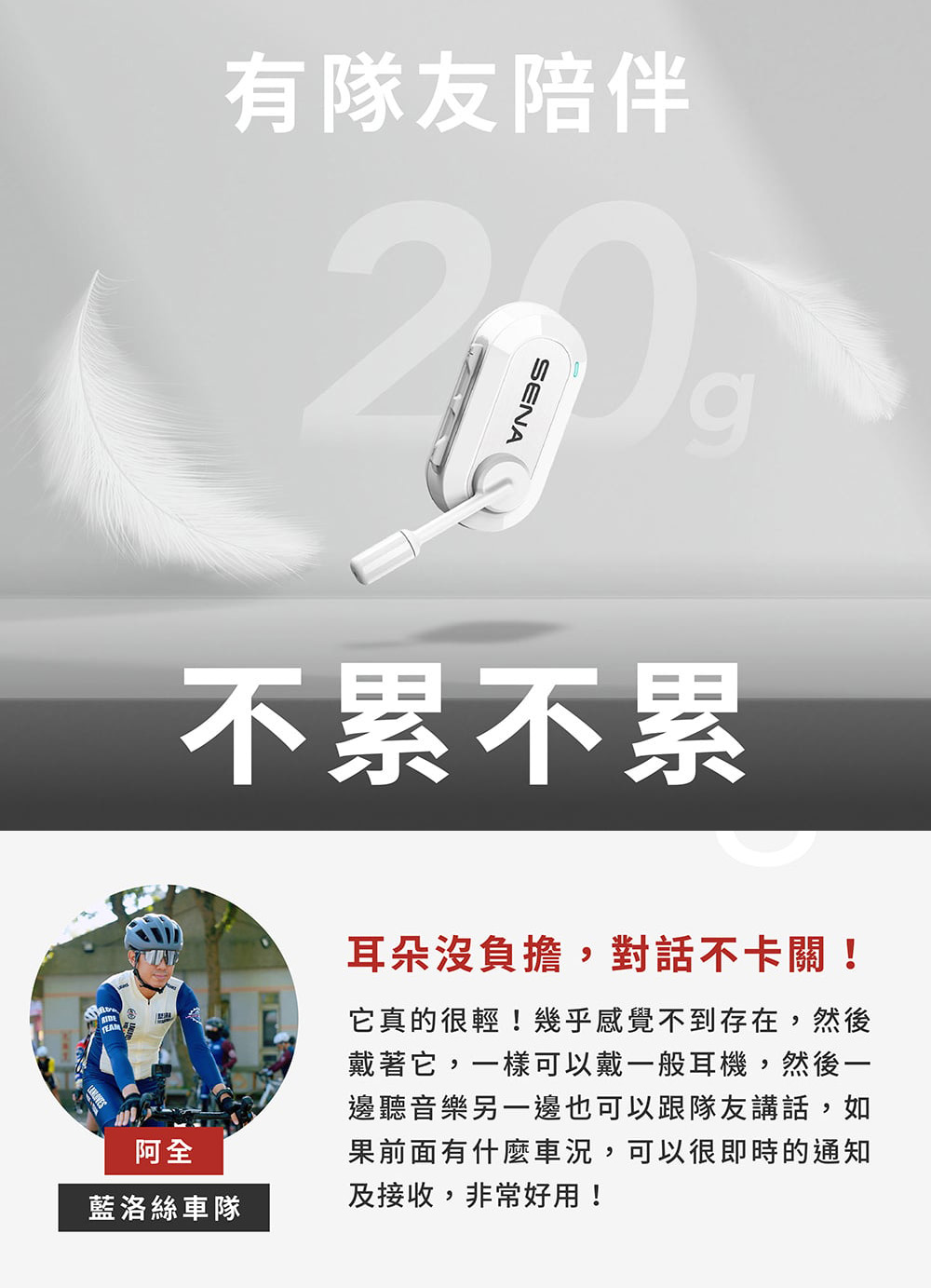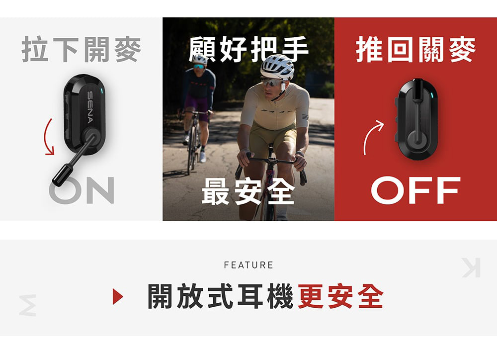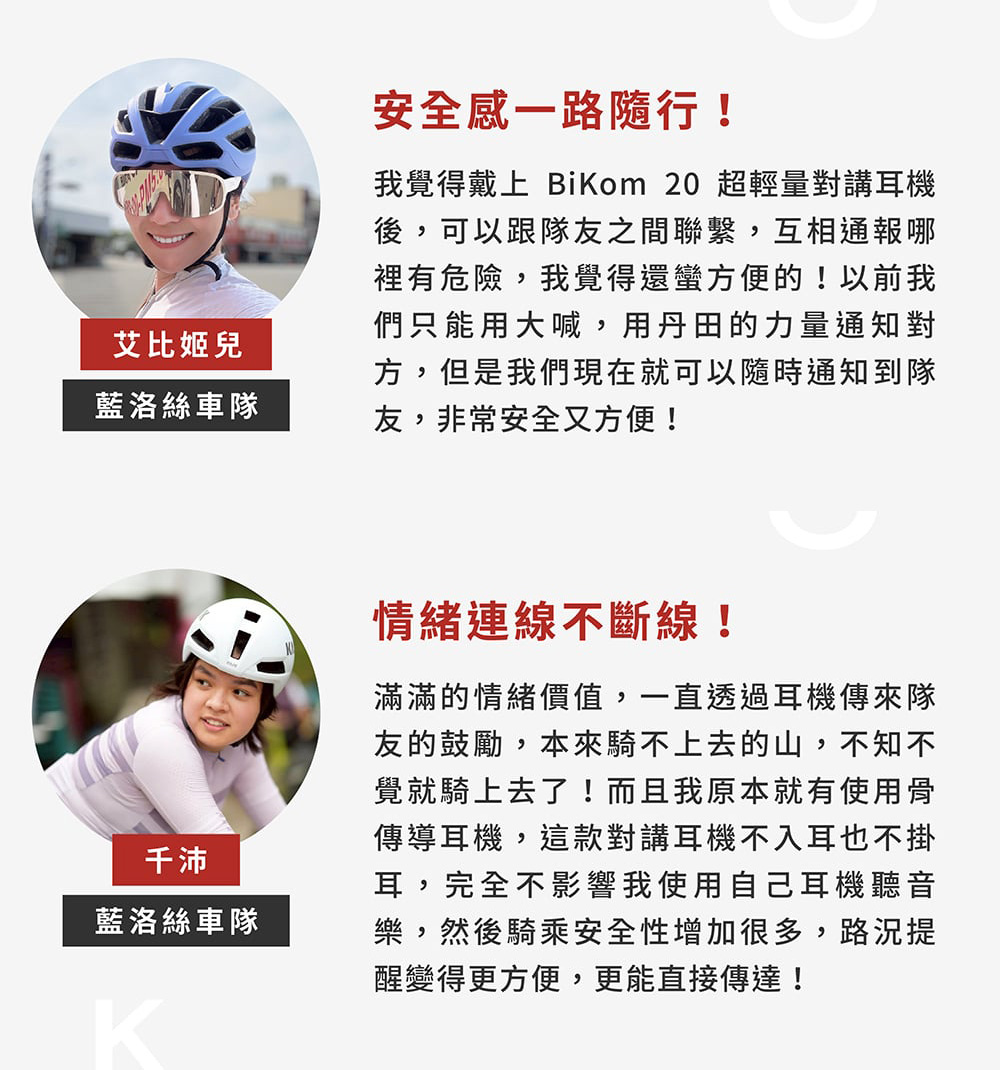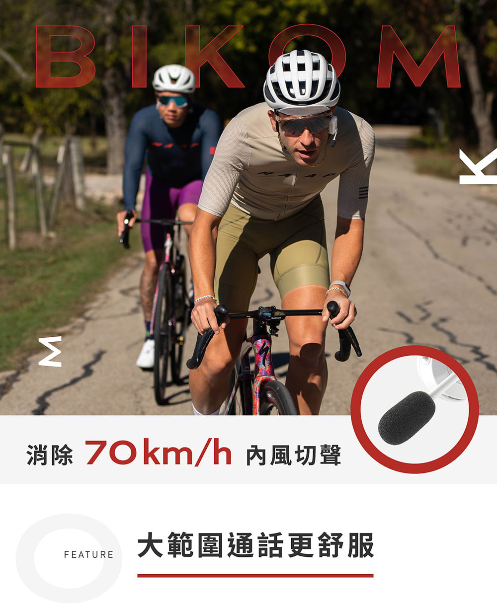 BiKom 20 採用開放式耳機設計,騎乘時能清楚聽見環境聲響,與隊友交流、掌握路況零延遲。