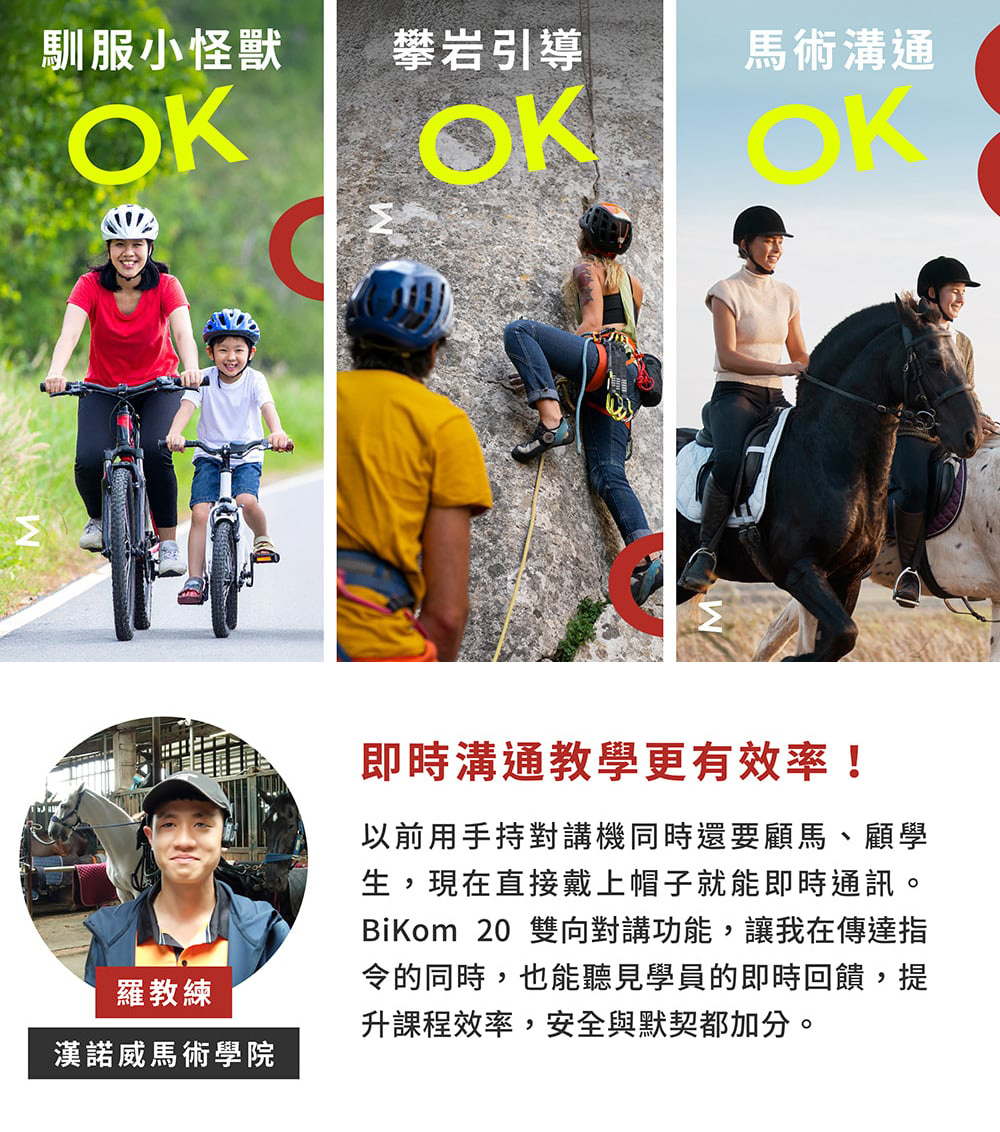 BiKom 20 超輕量對講耳機不只適合自行車,他的輕巧設計與穩定通話,不論是在滑雪、登山、親子戶外活動、攀岩、馬術、滑板....