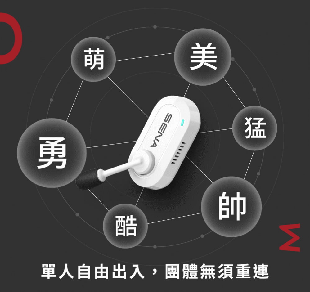最新 SENA Mesh 3.0 網狀連線沒有連線順序限制,任何一個人都是通話節點,從此再也不用擔心個人脫隊後會讓團隊全體斷線,其他人通話完全不受影響,而且只要迷路的夥伴回到範圍內就會自動加回對話,不用停下來設定騎乘更絲滑。