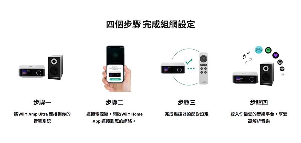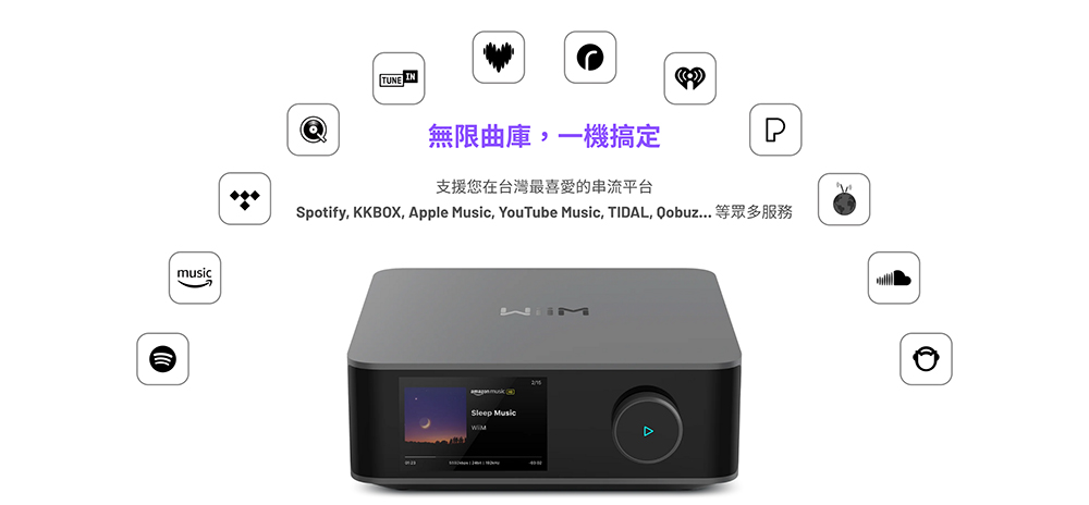 | 6. 支援哪些音樂服務? | 您可以透過 WiiM Home 應用程式或您喜歡的播放協議,從 KKBOX, Spotify、TIDAL、Qobuz、Amazon Music、Deezer、Pandora、TuneIn、SoundCloud、iHeartRadio 等平台播放音樂。 |