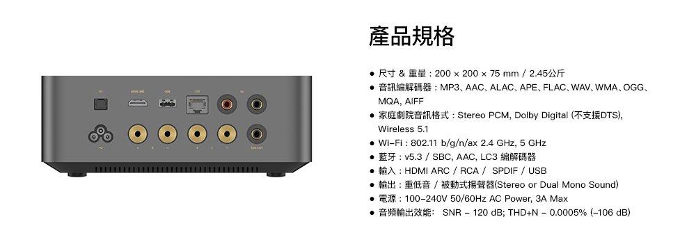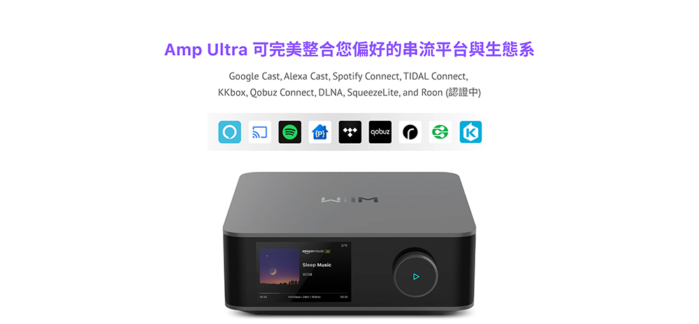 - 支援串流平台:GoogleCast Audio, Spotify Connect, Tidal Connect, KKBOX, Alexa, Roon Ready, Qobuz Connect, DLNA