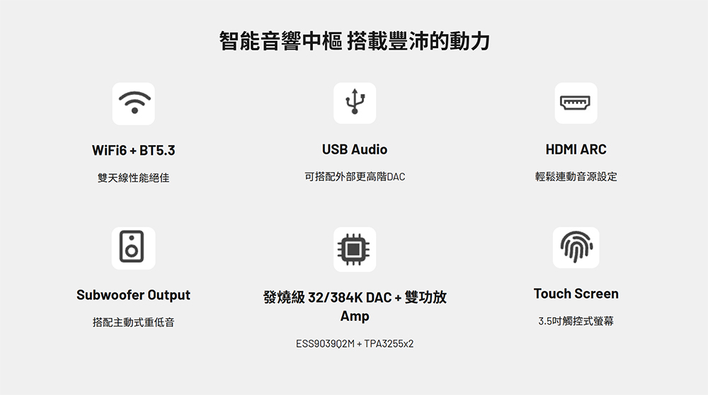 | 支援串流平台 | GoogleCast Audio, Spotify Connect, Tidal Connect, KKBOX, Alexa, Roon Ready, Qobuz Connect, DLNA(不支援Airplay2) | GoogleCast Audio, Spotify Connect, Tidal Connect, KKBOX, Alexa, Roon Ready, Qobuz Connect, DLNA (不支援Airplay2) | GoogleCast Audio, Spotify Connect, Tidal Connect, KKBOX, Alexa, Roon Ready, Qobuz Connect, DLNA,Airplay2 |
