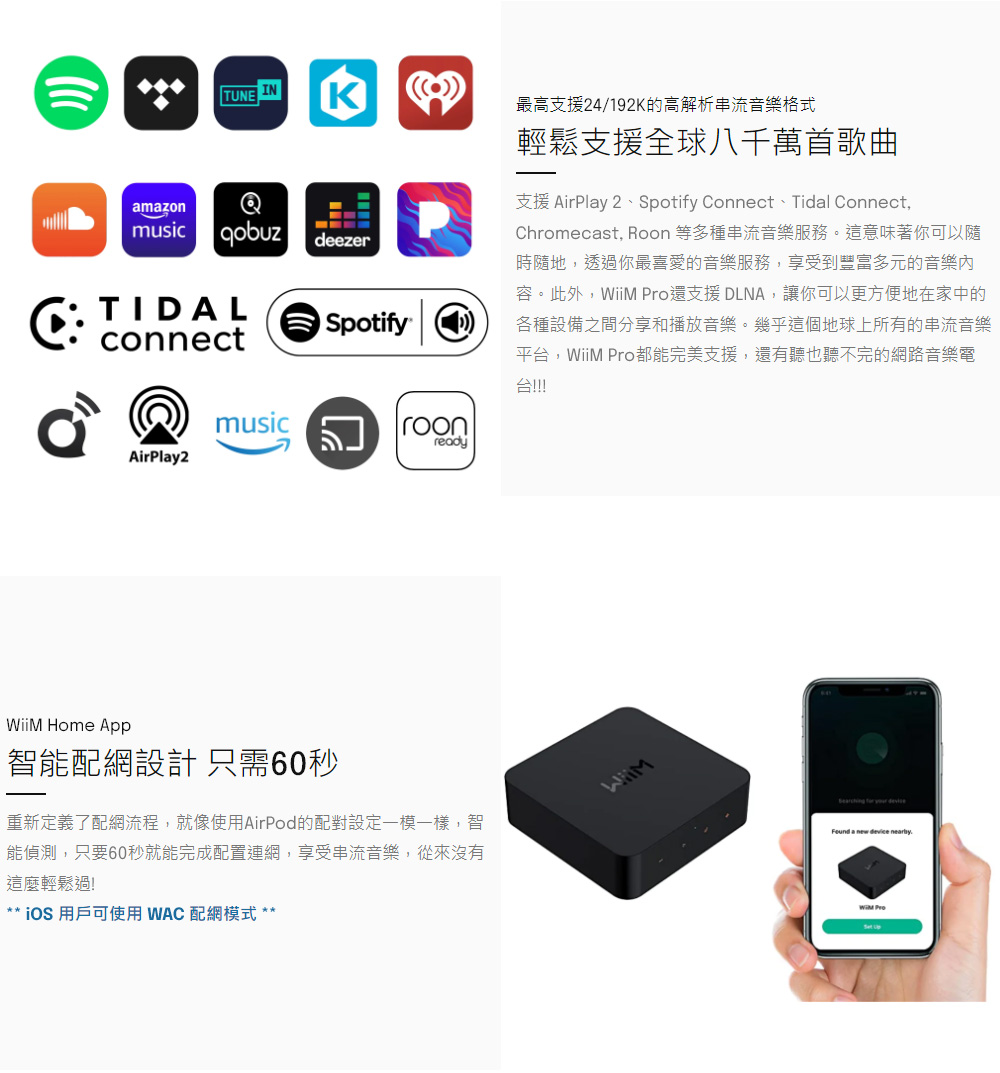- 支援 AirPlay 2、Spotify Connect、KKBox、Tidal Connect、Chromecast、Roon 等多種串流音樂服務